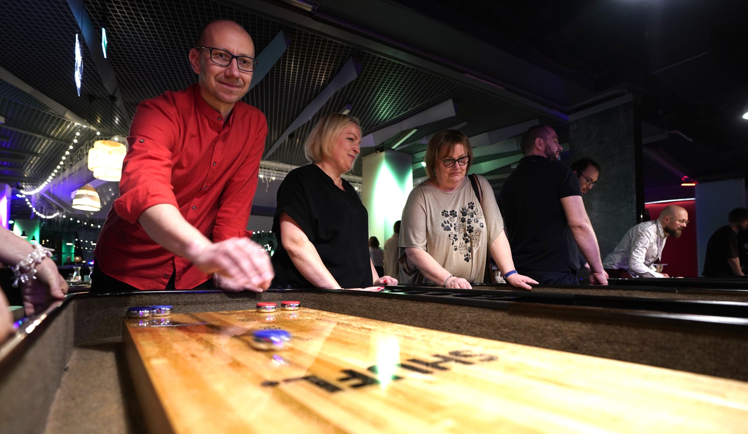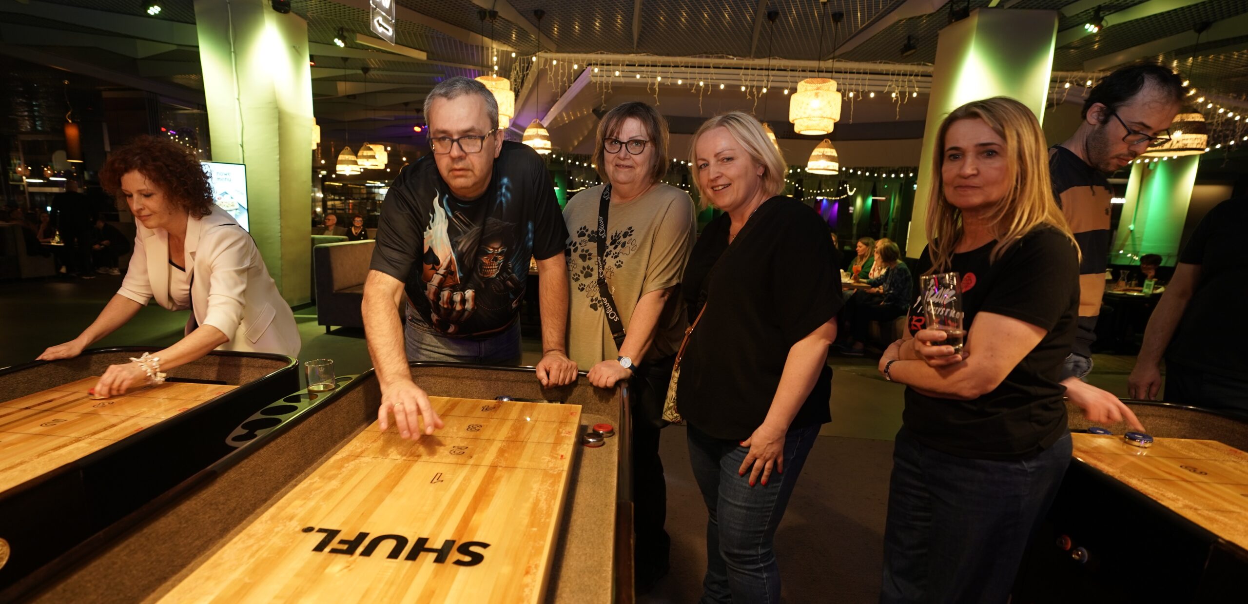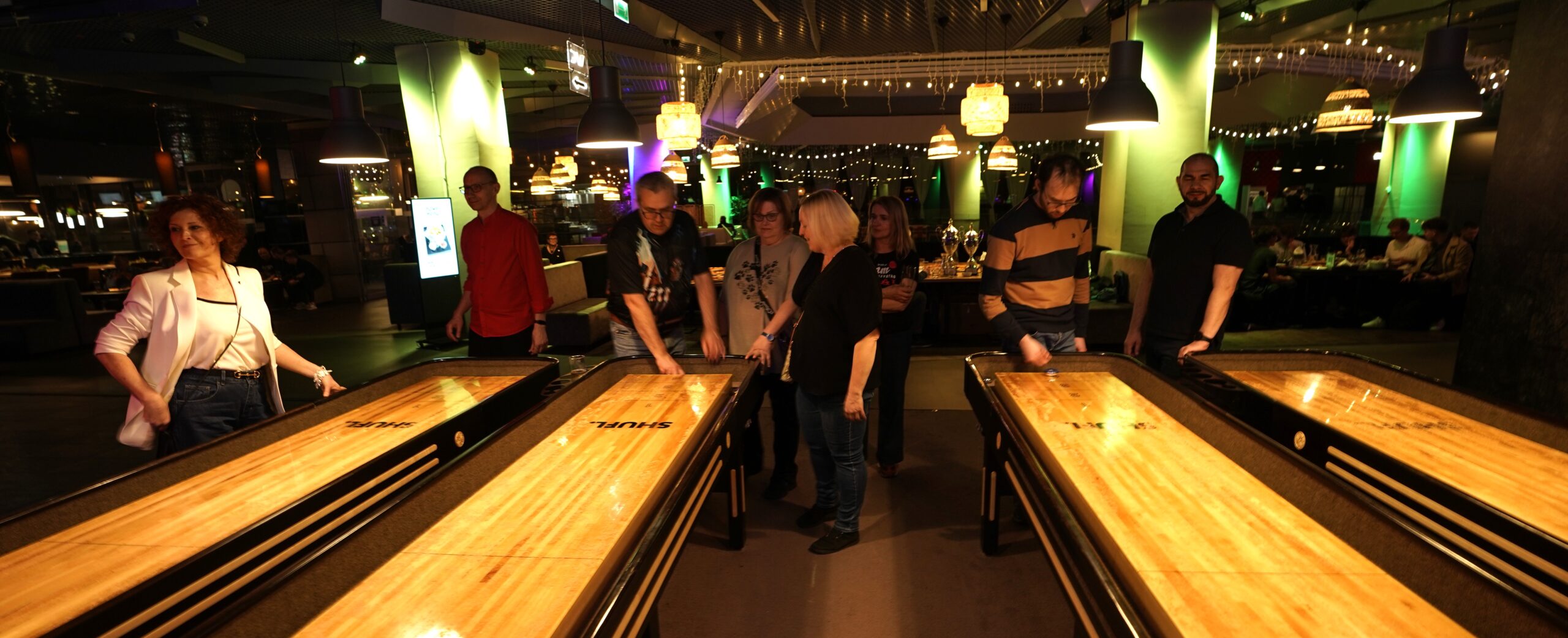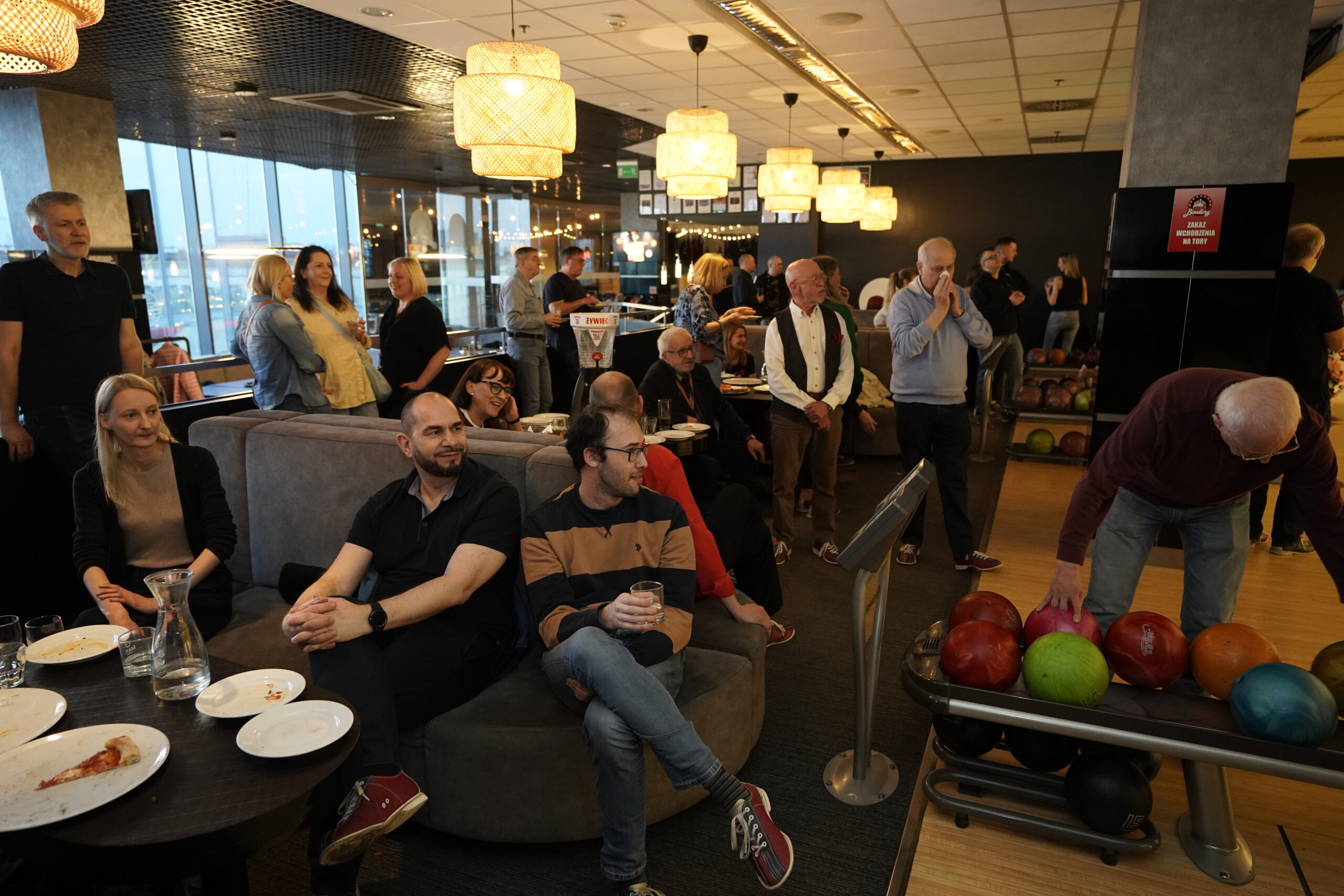 Uroczyste wręczenie pucharów odbyło się tego samego wieczoru poza Klubem. Spotkaliśmy się w MK Bowling, gdzie formalna część szybko przeszła w integrację na luzie. Po kilku godzinach maksymalnej koncentracji przy stole brydżowym przyszedł czas na ruch, śmiech i odrobinę sportowej rywalizacji w zupełnie innej formie. Bowling, shuffleboard i rozmowy bez kart w ręku – idealne domknięcie dnia, które pokazuje, że brydż to nie tylko gra, ale przede wszystkim ludzie i relacje.