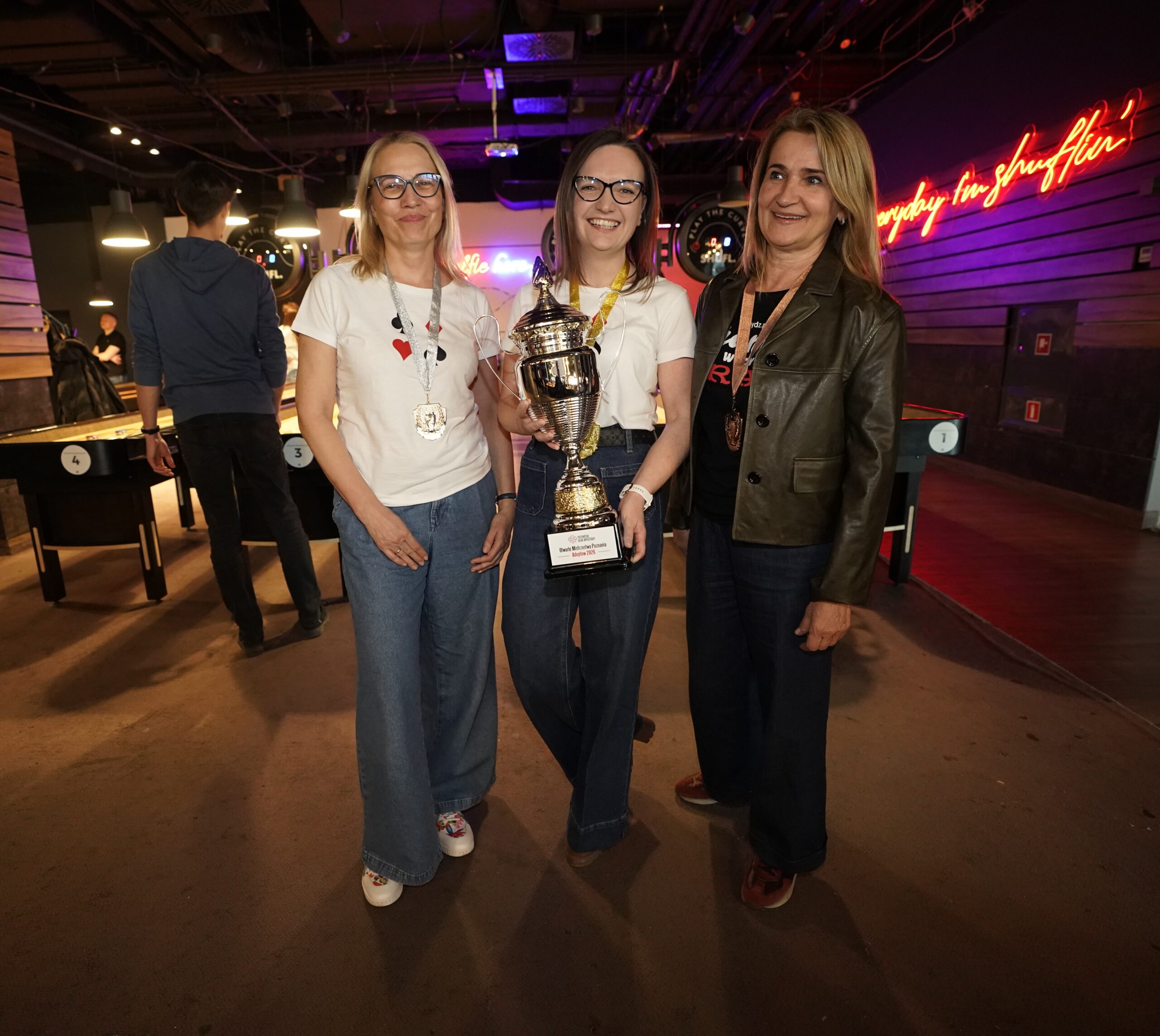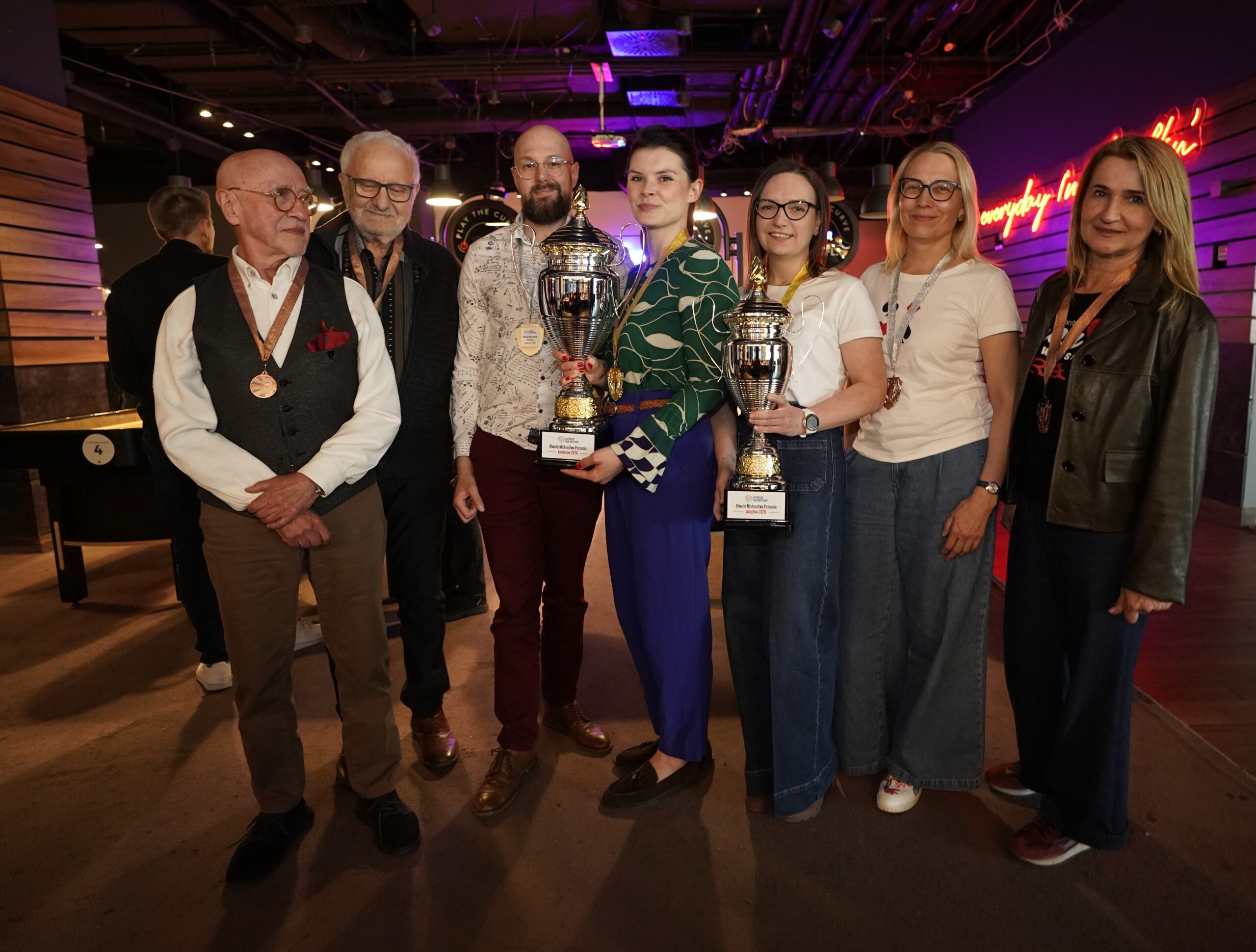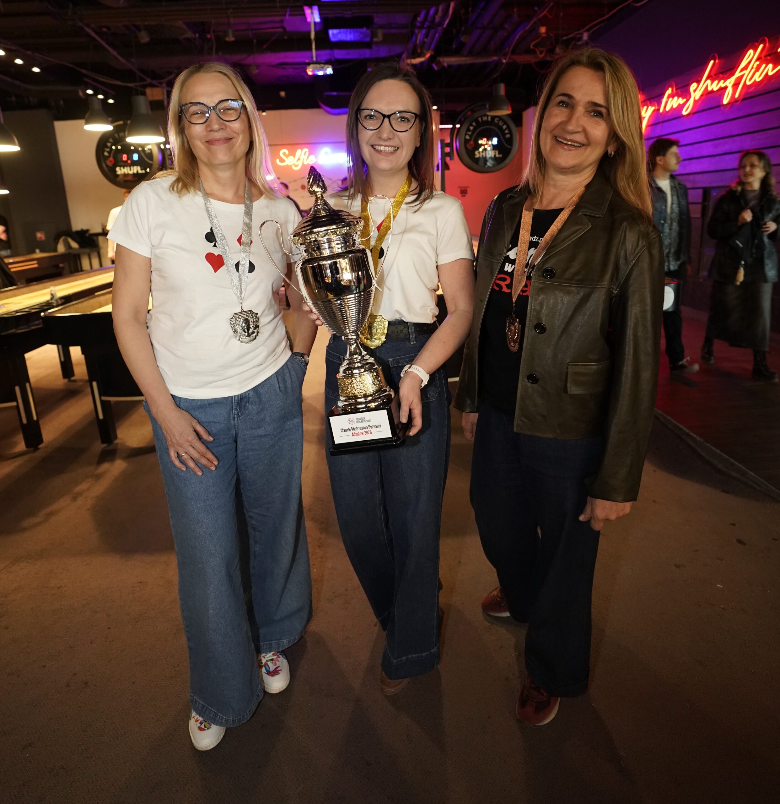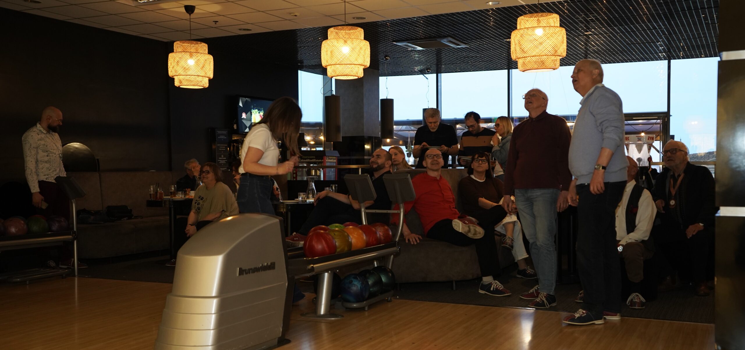 Uroczyste wręczenie pucharów odbyło się tego samego wieczoru poza Klubem. Spotkaliśmy się w MK Bowling, gdzie formalna część szybko przeszła w integrację na luzie. Po kilku godzinach maksymalnej koncentracji przy stole brydżowym przyszedł czas na ruch, śmiech i odrobinę sportowej rywalizacji w zupełnie innej formie. Bowling, shuffleboard i rozmowy bez kart w ręku – idealne domknięcie dnia, które pokazuje, że brydż to nie tylko gra, ale przede wszystkim ludzie i relacje.