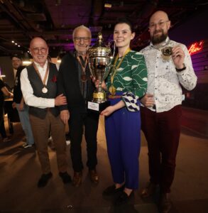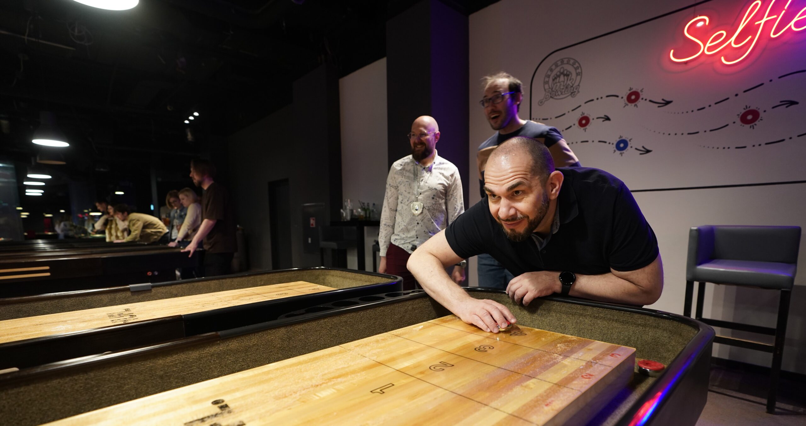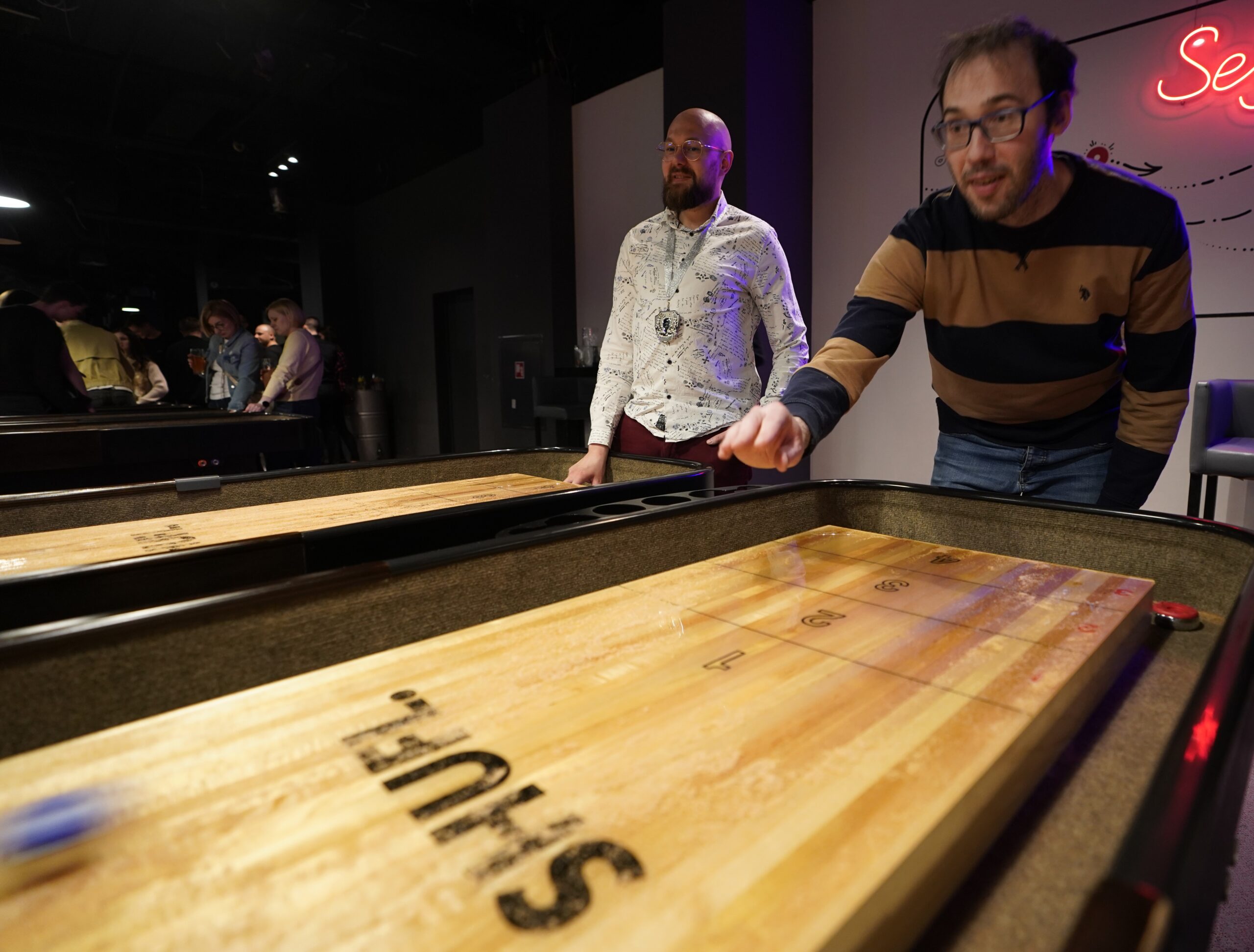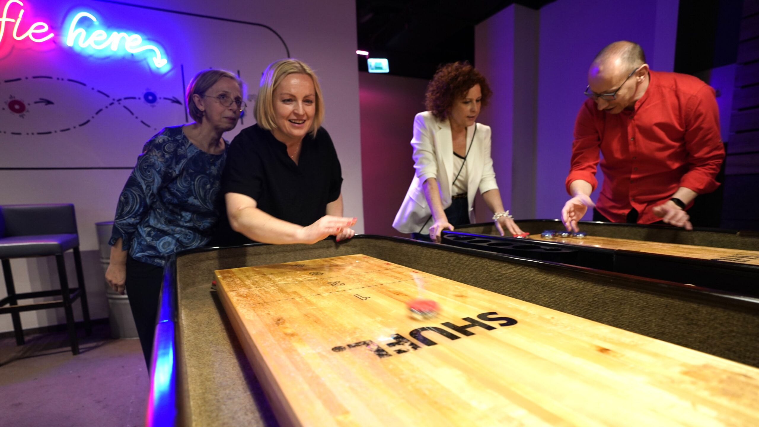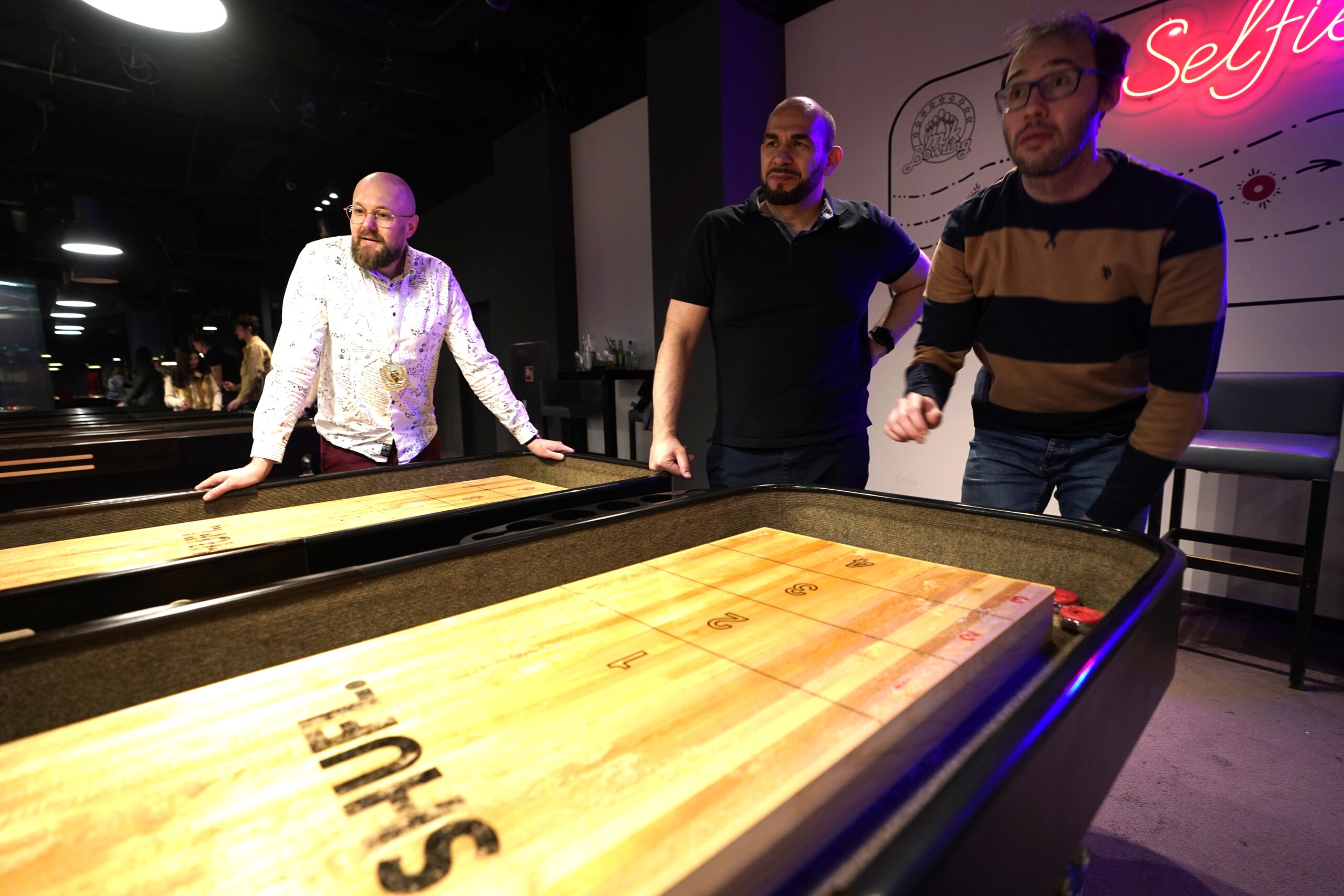 Uroczyste wręczenie pucharów odbyło się tego samego wieczoru poza Klubem. Spotkaliśmy się w MK Bowling, gdzie formalna część szybko przeszła w integrację na luzie. Po kilku godzinach maksymalnej koncentracji przy stole brydżowym przyszedł czas na ruch, śmiech i odrobinę sportowej rywalizacji w zupełnie innej formie. Bowling, shuffleboard i rozmowy bez kart w ręku – idealne domknięcie dnia, które pokazuje, że brydż to nie tylko gra, ale przede wszystkim ludzie i relacje.