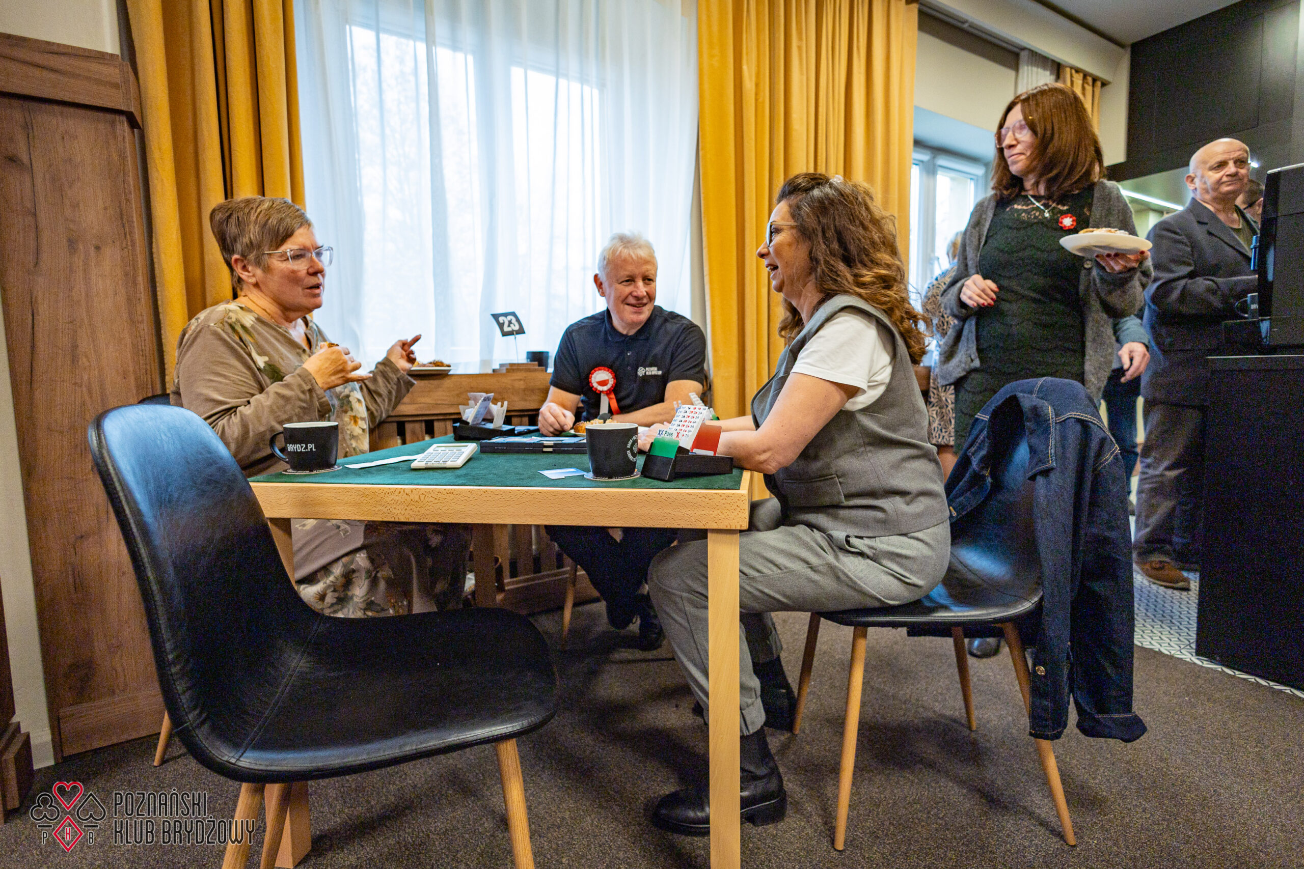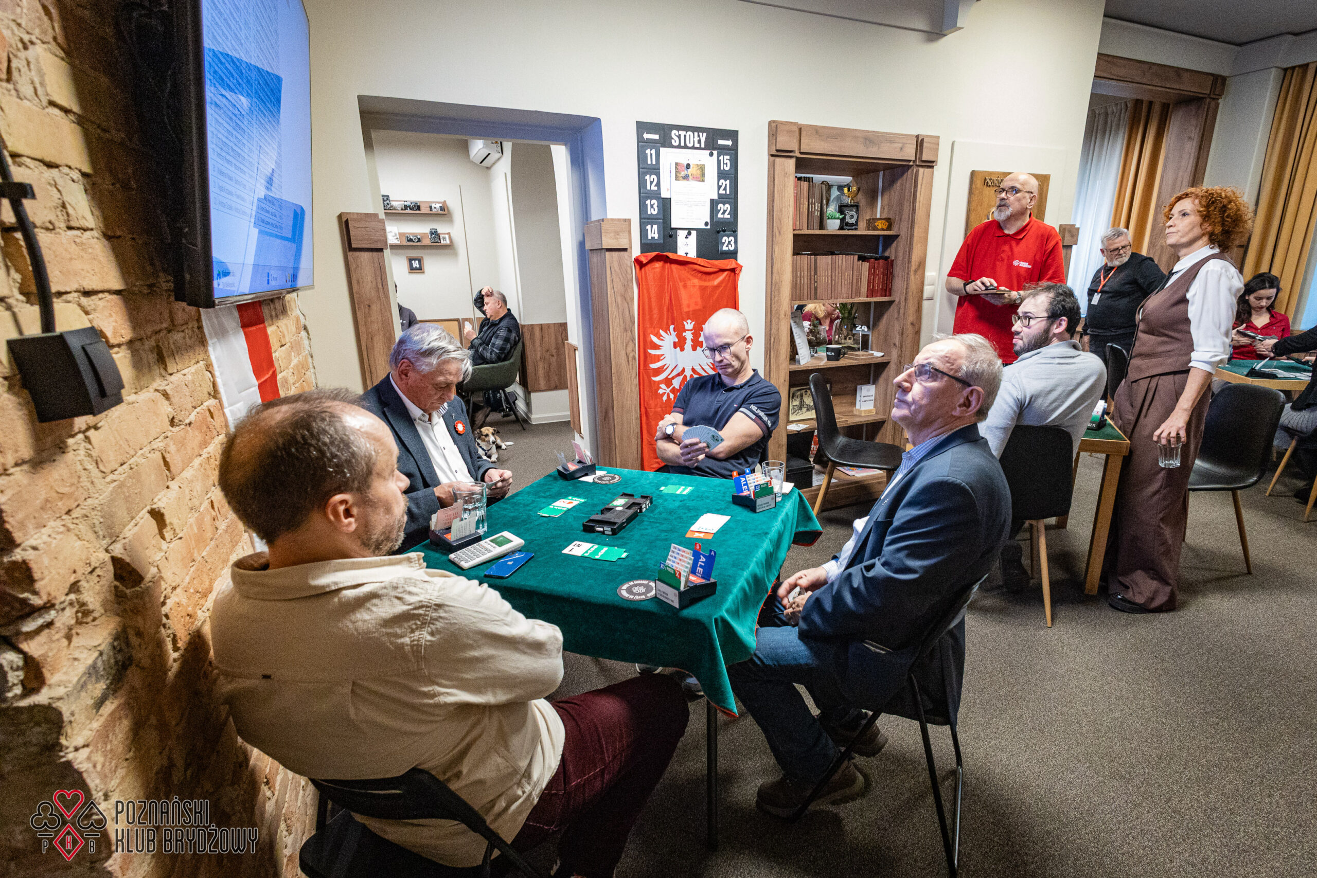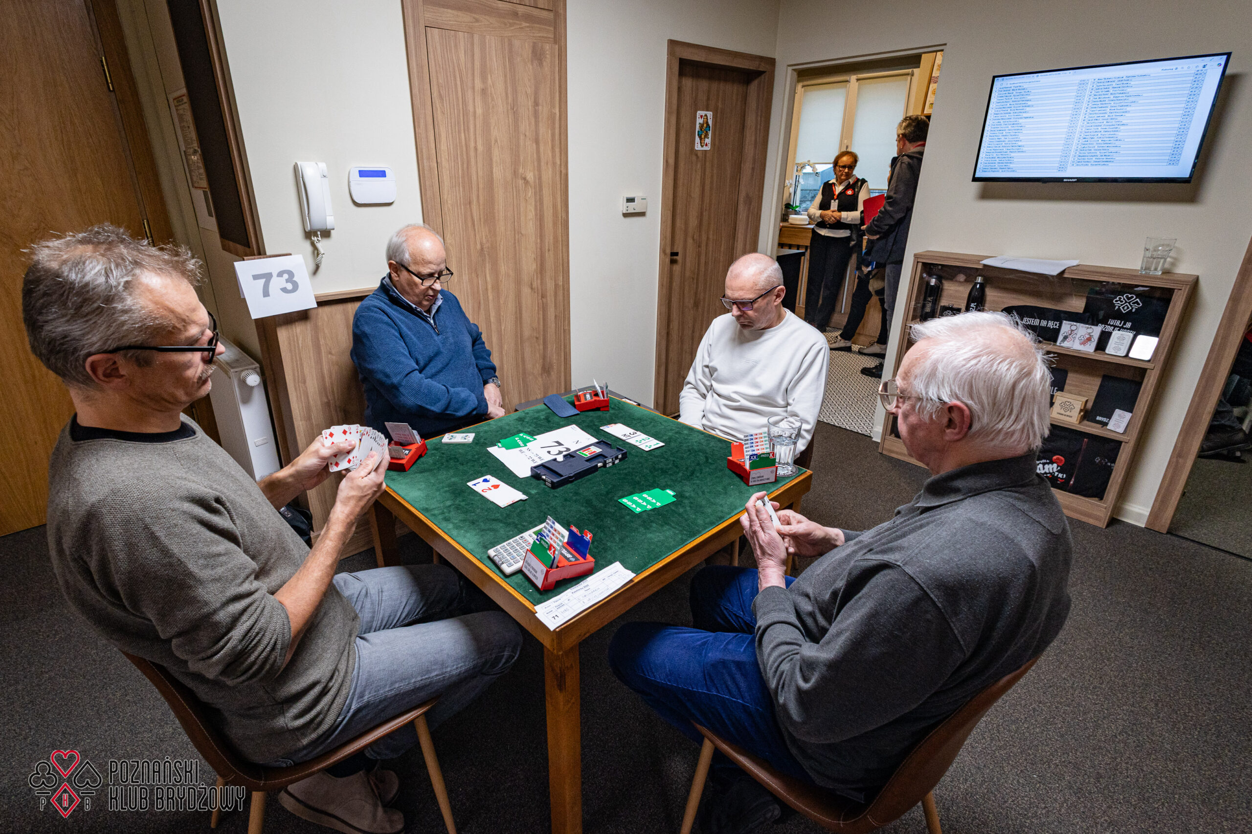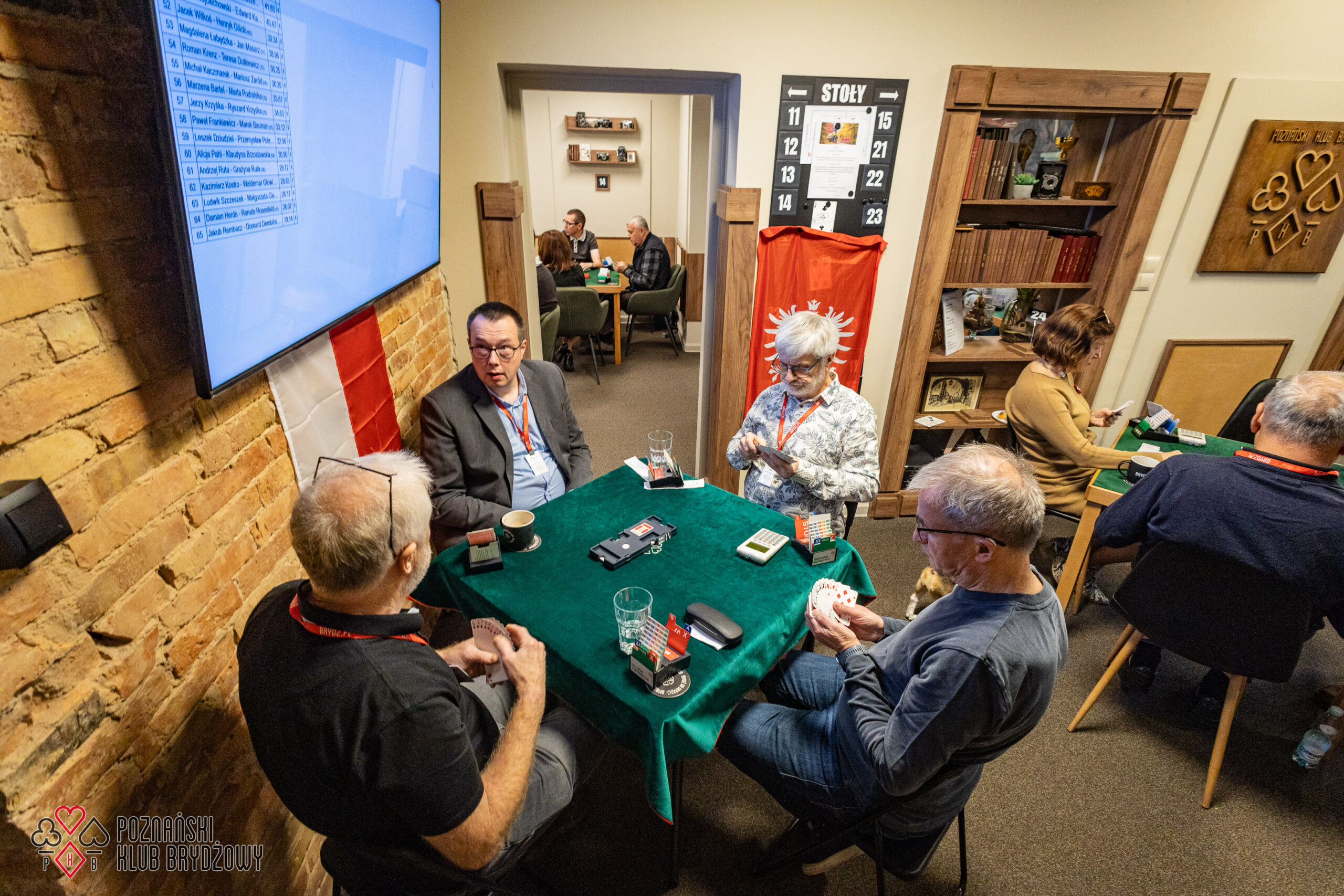Wspieraliśmy się pobliską lokalizacją szkoleniową ustawiając tam 10 stolików, stanowiące 2 sektory. Zmiana do kolejnej rundy następowała po 10 rozdaniach i wówczas pary dokonywały zmiany przemieszczając się około 100 metrów na odcinku Klub – sala szkoleniowa. Okazało się, że ro rozwiązane nie było żadnym problemem. Przeciwnie – podobało się licznym, którzy wykorzystali chwilę spaceru na dotlenienie i zrelaksowanie się :).