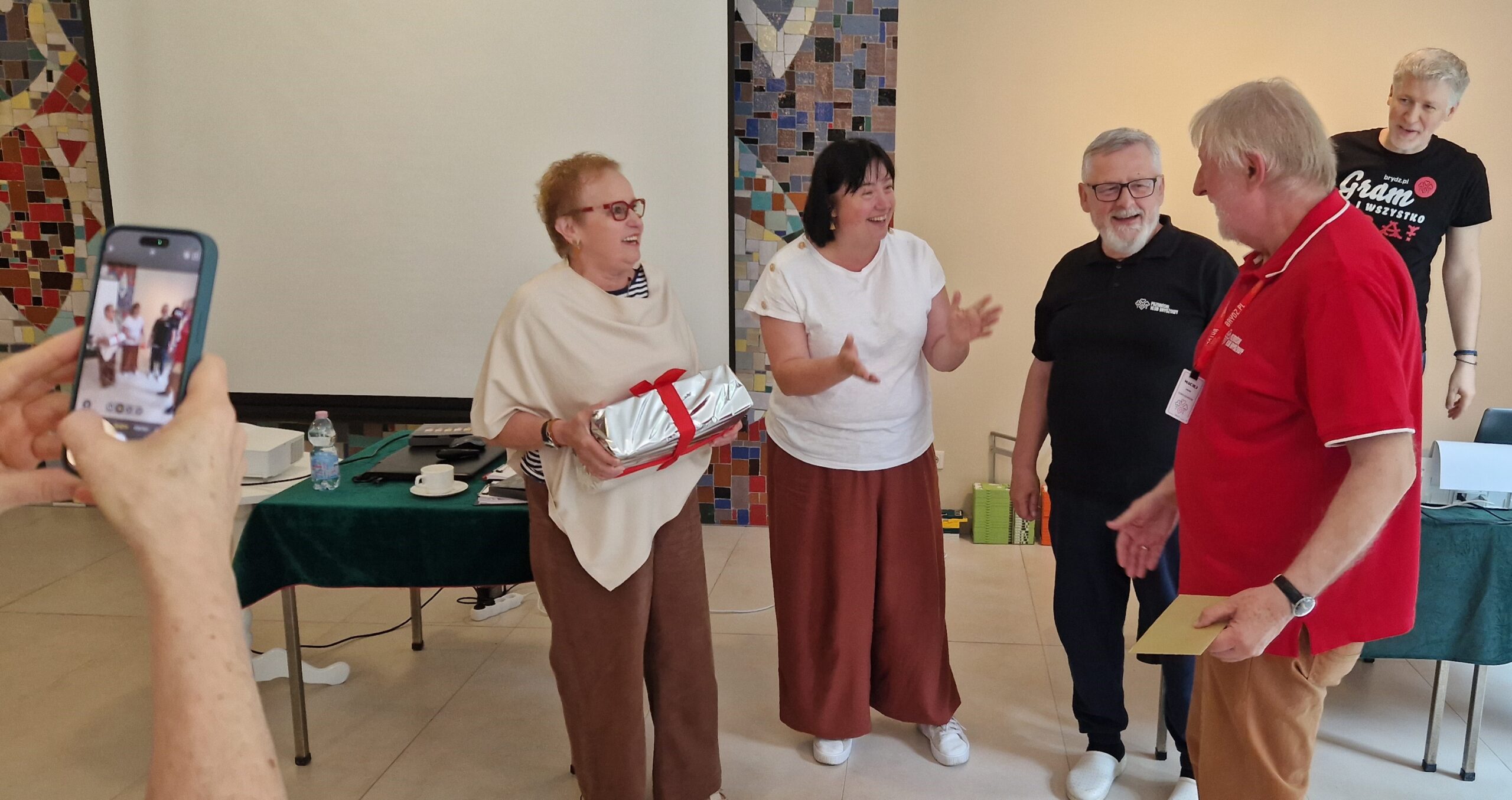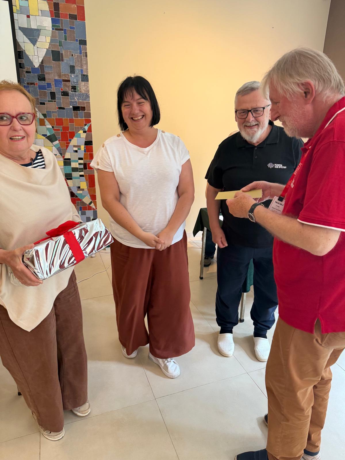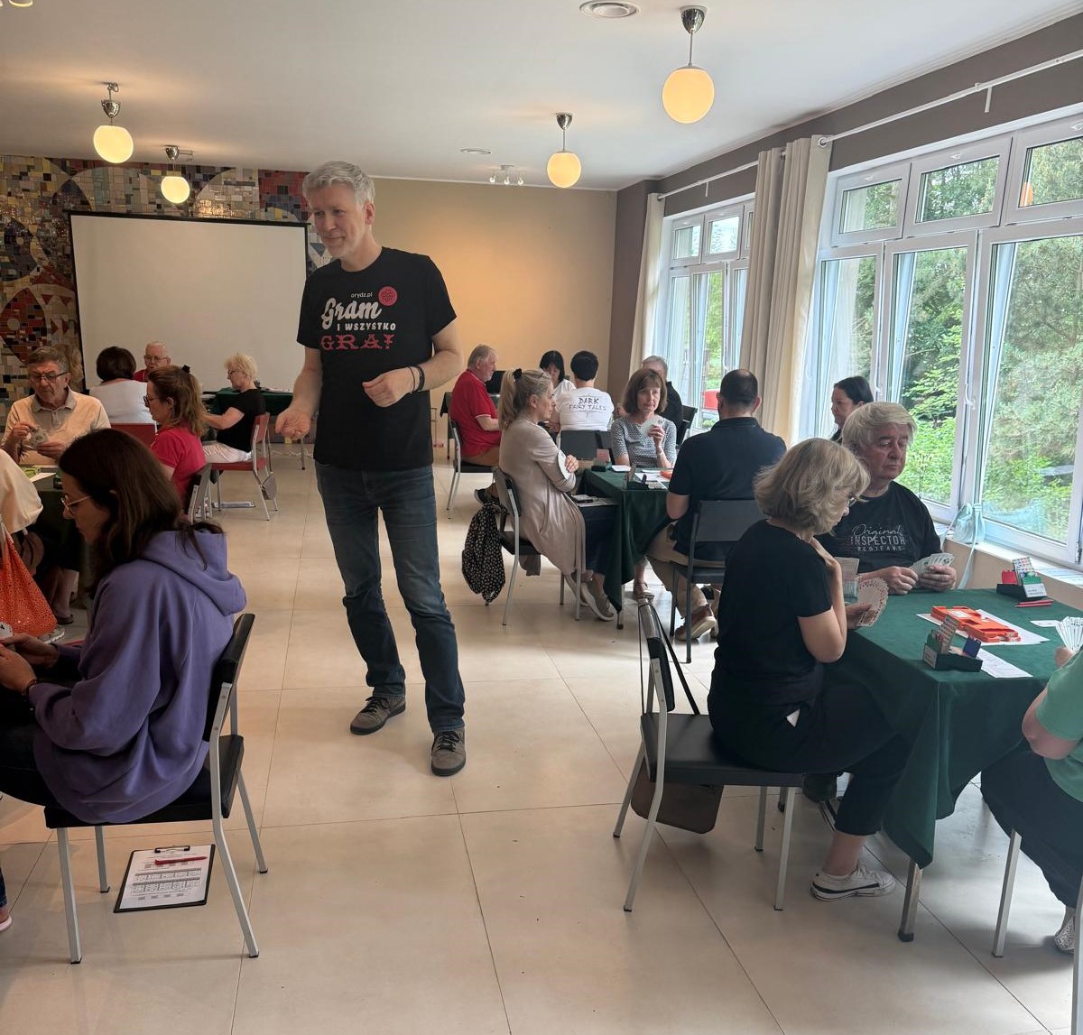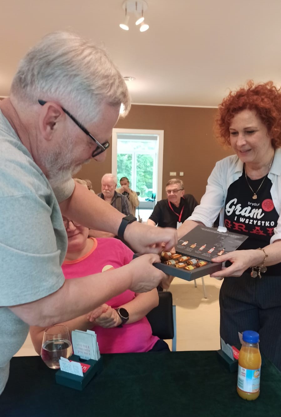 W sobotę nastąpił jeden szczególny moment – i to zupełnie niebrydżowy. Okazało się, że jeden z naszych uczestników, Maciej Podhorecki, obchodził niedawno okrągłe urodziny. Grupa postanowiła zaskoczyć solenizanta pamiętając o tym i wręczając prezent. Wspólnie odśpiewaliśmy gromkie „Sto lat”!